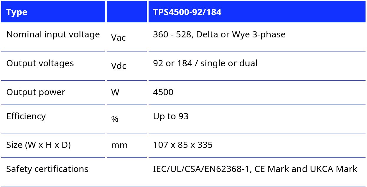 The TPS4500 series is fully featured with isolated AC Fail, DC Good and dropped phase signals, remote on/off, remote sense, and a 12 V, 0.3 A standby supply. The PMBus™ communications interface enables comprehensive remote monitoring and control. It provides real-time visibility of key parameters such as output voltage, output current, internal temperature, status signals, and fan speed. Additionally, PMBus™ allows programming of critical settings, including output voltage, overcurrent limit, and remote on/off functionality. Nominal outputs of 92 V, 49 A and 184 V, 24.5 A are fully adjustable via PMBus™: 92 V can be set from 10 – 96.5 V, and 184 V from 20 – 193 V.